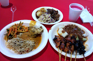 Clockwise from Top: Roasted Lamb with mashed potato and coleslaw, satays (beef and chicken), biryani rice with acar. The cup on the right is 'air bandung' (some sort of syrup drink)
